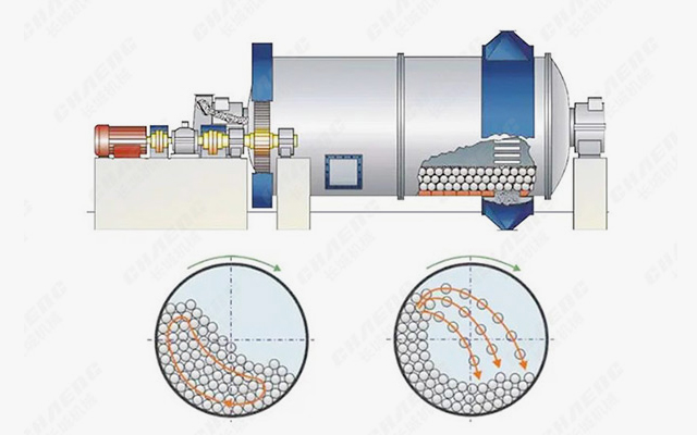 物料由進料裝置經(jīng)入料中空軸螺旋均勻地進入球磨機第一倉,該倉內(nèi)有階梯襯板或波紋襯板,內(nèi)裝不同規(guī)格鋼球,筒體轉(zhuǎn)動產(chǎn)生離心力將鋼球帶到一定高度后落下,對物料產(chǎn)生重?fù)艉脱心プ饔?。物料在第一倉達(dá)到粗磨后,經(jīng)單層隔倉板進入第二倉,該倉內(nèi)鑲有平襯板,內(nèi)有鋼球,將物料進一步研磨。粉狀物通過卸料箅板排出,完成粉磨作業(yè)。