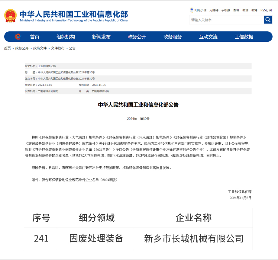近日,中華人民共和國工業(yè)和信息化部發(fā)布符合環(huán)保裝備制造業(yè)規(guī)范條件企業(yè)名單(2024年版)。其中,固廢處理裝備類企業(yè),新增11家,復核通過47家。新鄉(xiāng)市長城機械有限公司憑借固廢處理領域的創(chuàng)新技術和卓越表現(xiàn),繼2021年入選環(huán)保裝備制造業(yè)規(guī)范條件企業(yè)名單后,今年度再次順利通過復核。