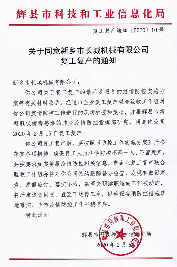 2月14日下午,經(jīng)過市企業(yè)復工復產(chǎn)聯(lián)合驗收工作組對我公司疫情防控工作進行的現(xiàn)場核查和復檢,并報輝縣市新型冠狀病毒感染的肺炎疫情防控指揮部研究,同意我公司2020年2月15日復工復產(chǎn)。