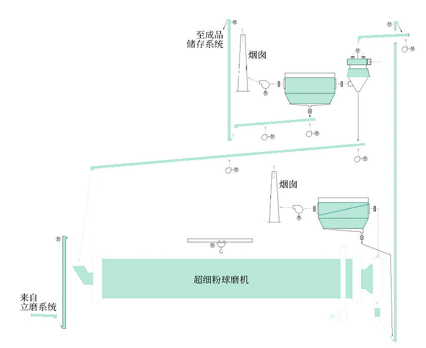 01來自立磨系統(tǒng)的物料粉,由提升機(jī)輸送至超細(xì)球磨機(jī)內(nèi)進(jìn)行粉磨,超細(xì)球磨機(jī)出口處配有收塵器對(duì)揚(yáng)塵處收塵;